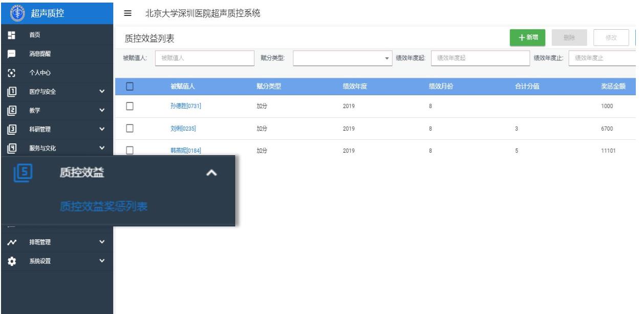 记录、统计、查询获得奖励的医生及相关信息,包括赋分类型、日期、分值、奖惩金额以及放发状态等。