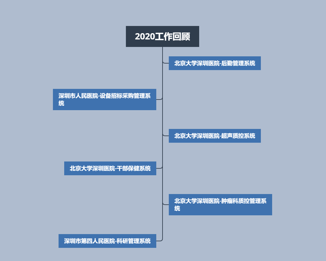智慧后勤管理系统、超声质控管理系统、干部保健系统、肿瘤科质控管理系统在2020年正式在北京大学深圳医院投入使用,智慧后勤系统采用互联网、物联网、大数据做到一站式后勤精细化管理。医院借助信息化手段及时掌握需求和问题,通过科学的数据分析解决问题,使医院管理更高效。全面实现全院实时监控、实时预警、实时报修;