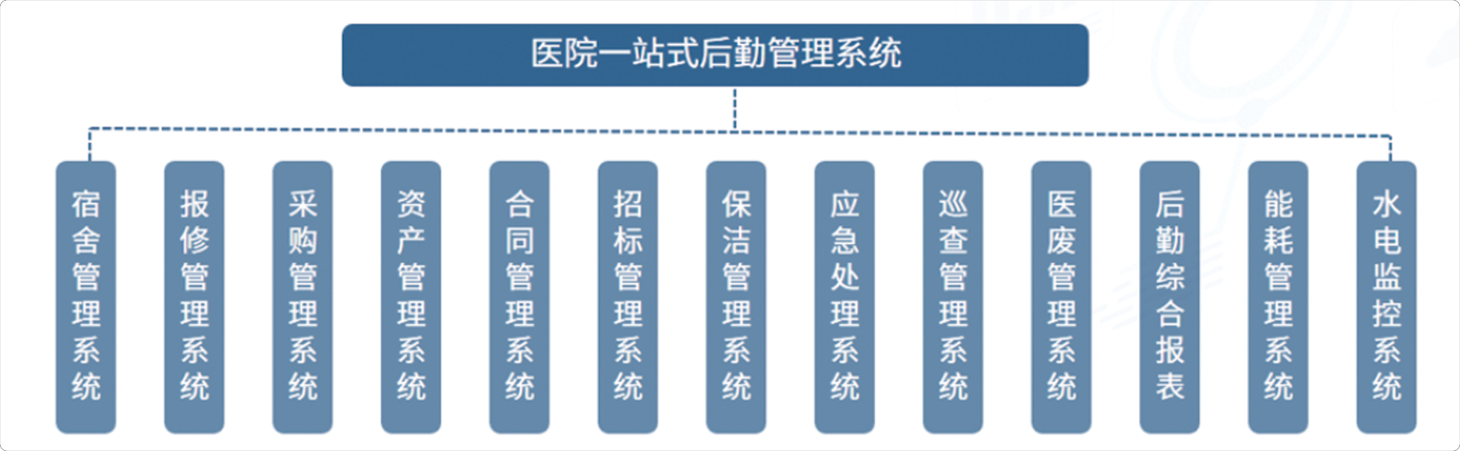 和智物联一站式后勤管理包括∶能耗管理、宿舍管理、清洁管理、招标管理采购管理、资产管理、报修管理、医辅管理、治安巡查、设备巡查、消防巡查、一般巡查等。