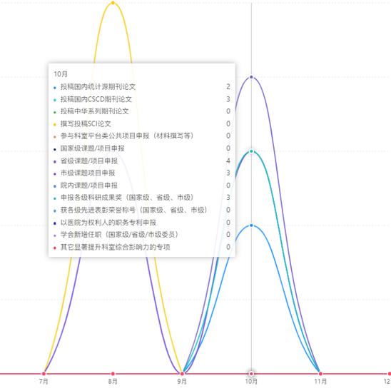 科研质控统计填报、审核、查询,对医生的科研课题、论文发表、三科成果等进行质检,并生成教学正性、负性汇总线性图。
